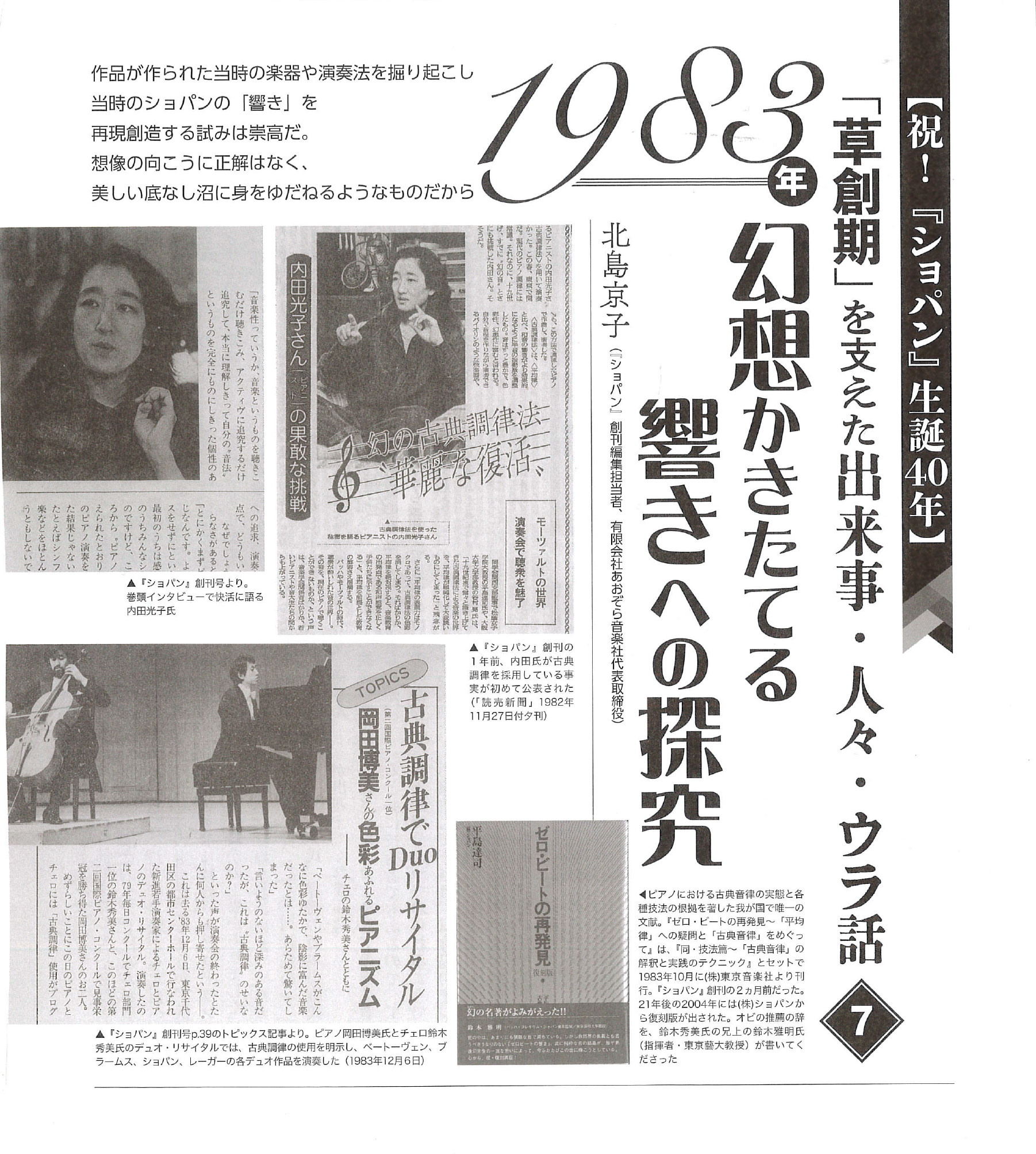 そうこうする1983年の春、ロンドン在住の内田光子氏が、日本で「モーツァルト・ピアノソナタ全曲演奏会」を開き話題になっていた。その際に使われている調律が古典調律だとささやかれ、これに鋭く反応した内藤編集長は、新聞記者を使って、帰国中の内田氏からウラを取ることに成功した(右ページ新聞記事)。使っていた調律はヴェルクマイスター第3法だった。まさに制作中の平島教授の『ゼロ・ビートの再発見』の理論を肯定し裏づける、どんぴしゃりの演奏取り組みだった。