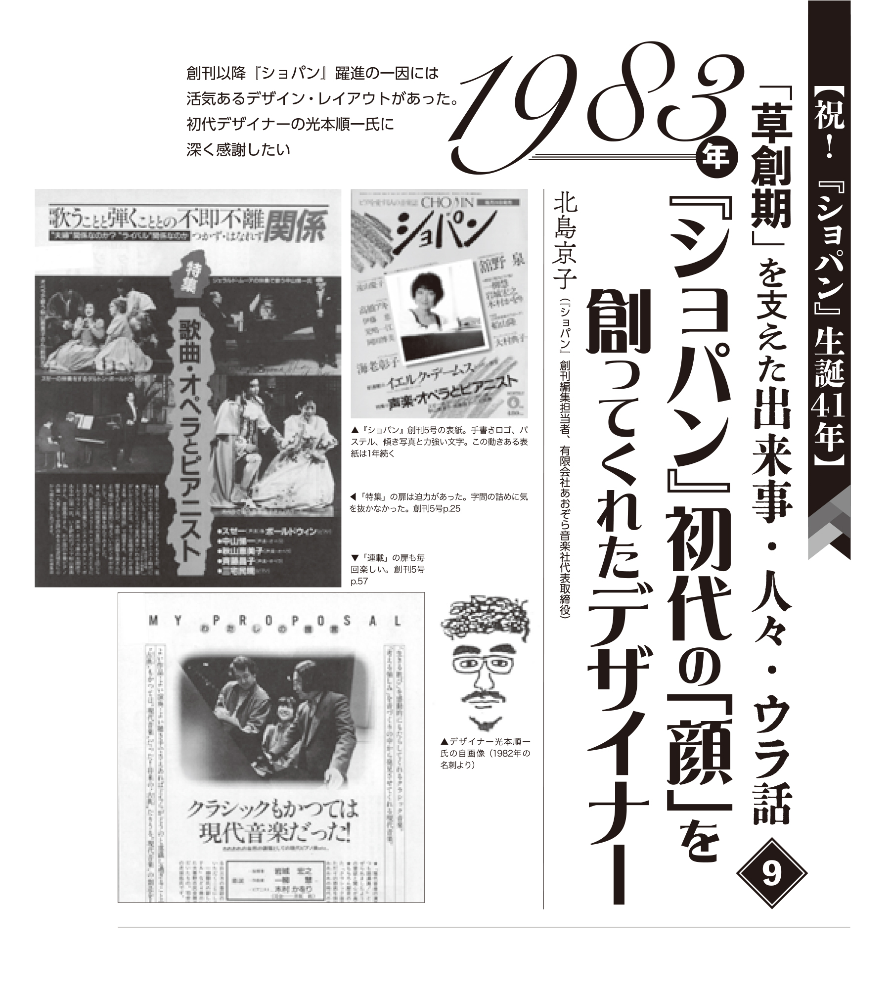 そして講談社の『ダンス世界一』から一年後、光本さんは『ショパン』創刊のためのデザインを引き受けて東京音楽社に現れた。「クラシックやピアノは初めてですよ」と言いながら、力強くかつ繊細なレイアウトで『ショパン』に生命を吹き込んだ。動きのある表紙は雑誌の顔となった。