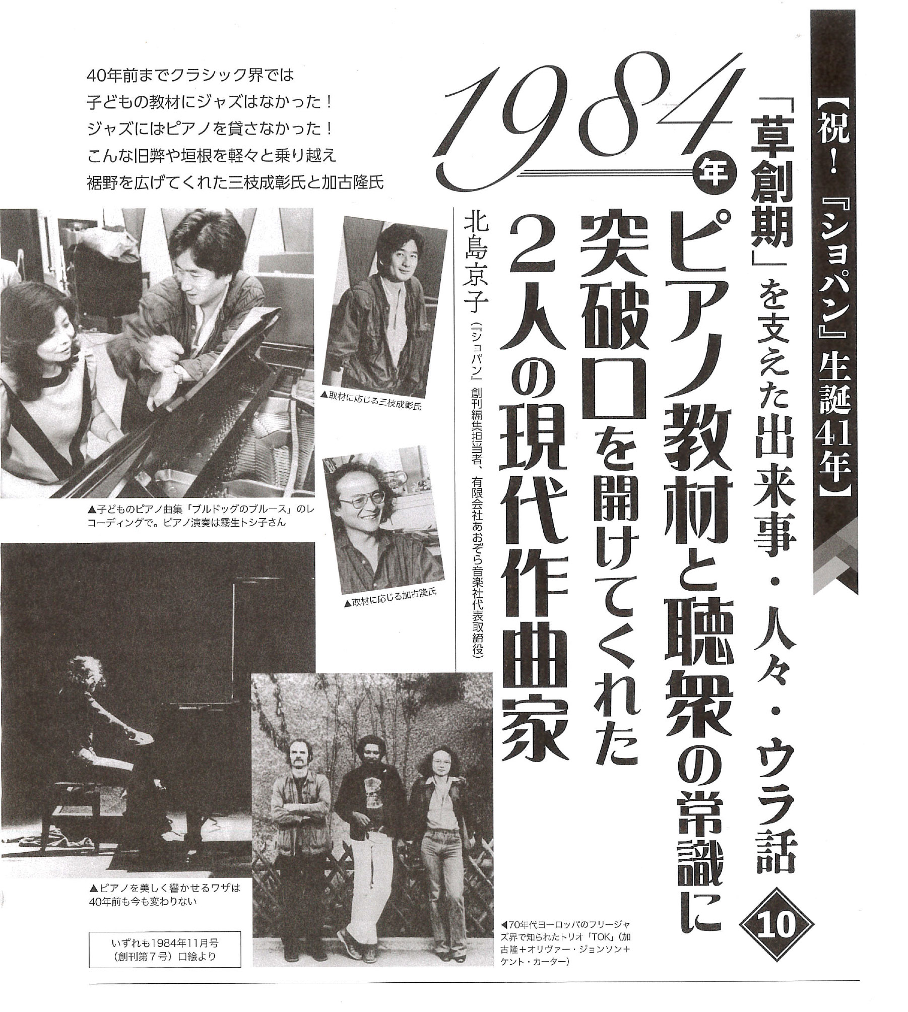 映画や劇音楽の作曲で有名なピアニストの加古隆氏は、ショパン創刊時の41年前はフランスで名が知られたフリージャズの演奏家だった。東京藝大作曲科に学び同大学院を出た後、パリ音楽院でメシアンに師事し現代音楽を追求した。在学中からフリージャズのトリオ「TOK (トーク)」を結成し即興演奏を行い、1980年に帰国。その折、空いたアパートには同じメシアンに師事する後輩のピアニスト藤井一興さんが入ったと言われる。